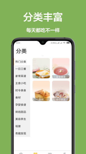 5. 强大的分类包括菜系、南北风味菜谱、家常菜菜谱、快手菜菜谱、创意菜菜谱、素菜菜谱、凉菜菜谱、面食菜谱、粥、汤类菜谱、烘焙菜谱、西餐菜谱、孕妇菜谱、老人菜谱等等!