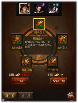 (2)战士技能:基础剑术、刺杀剑术、半月弯刀、野蛮冲撞、烈火剑法。