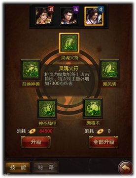 ① 灵魂火符:将灵力聚集纸符上攻击目标,每次攻击额外增加20点伤害。