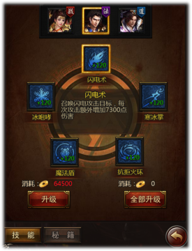 ② 雷电术:召唤雷电攻击目标,每次攻击额外增加30点伤害。