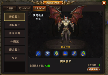 个人BOSS根据等级依次开放,等级越高,可以挑战的BOSS越强大。每个BOSS每天都可以挑战一次,进去后无论是否成功击杀BOSS次数都会消耗,进入之前一定要做好准备。高等级的个人BOSS地图需要消耗副本卷轴才可进入,副本卷轴可在未知暗殿掉落或花费绑元购买。