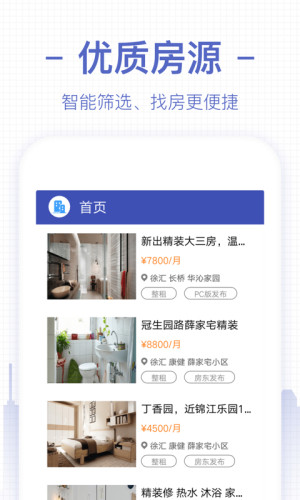 合租、整租、单身公寓:支持区域、地铁、价格、面积、户型等筛选;