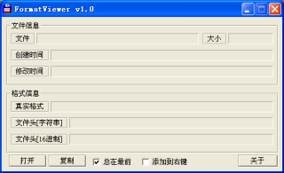 FormatViewer是一个查看文件真实格式的工具,它可以通过检查文件头标志来识别文件实际结构,使用方法很简单,只要将一个文件拖动到软件界面上来,文件的真实类型即可显示出来。