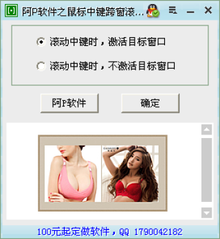 运行本程序后,无需激活目标窗口,只需将鼠标指针划到目标窗口任意位置(无需点击),滚动鼠标中键即可操作目标窗口纵向滚动条。用户亦可选操作目标窗口时是否自动激活该窗口。