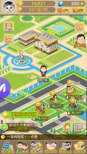 1、成为一个创业者,点击你别墅获得金钱然后打造各种不同的店铺来获得盈利;