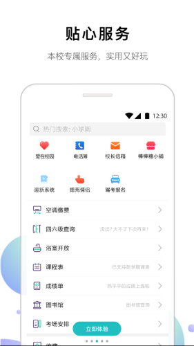 成绩单查询、四六级查询、图书馆查询及浴室开放情况查询等功能为一体