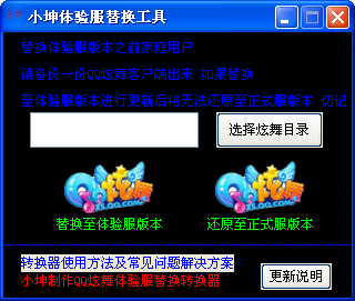 小坤炫舞体验服替换工具是一款QQ炫舞体验服转换器工具,最新版推出,支持qq炫舞3.5.6版本,该软件具有一键快速替换qq炫舞文件bin/config里面所在服务器地址,让您省去不必要的麻烦手动找寻文件复制替换烦恼,欢迎下载体验。