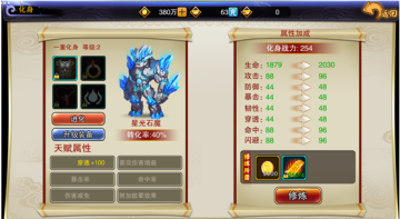 化身升级:通过消耗金币与化身培养灵符,可以提升化身的等级