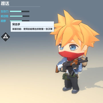 这个角色就厉害了,虽然血薄一点,但视野大啊,而且比什么暴君便宜多了6块就完事的事情,哪里需要什么128.不过这特性有点针对于不玩狙,狙不中或者讨厌狙的玩家,击倒人之后才能恢复一发子弹,有点苛刻,不让新手角色(提达)的暴击回子弹方便。