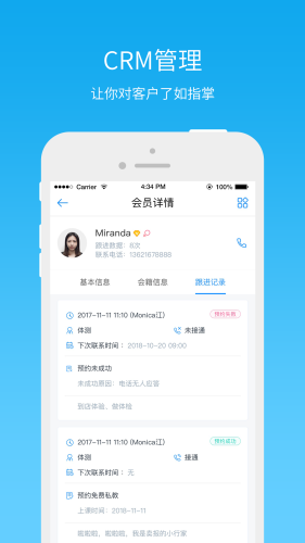 教练:在微信端查看个人业绩表、私教课程、私教会员管理;让会籍可以查看会员跟进情况、销售跟踪等;