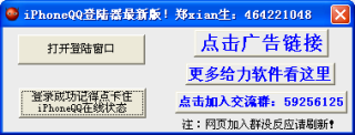 囧囧网论坛制作的iPhoneqq登陆器工具,点击exe软件即可运行,如果因为电脑系统或软件等原因,造成程序无法正常启动,可能就无法使用,那么大家可以选择囧囧网卡iPhoneQQ在线服务,网址是:http://www.jiojiow.com/iphoneqq.php。