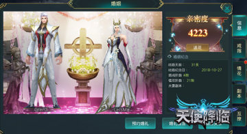 有没有对其他玩家一见倾心过?有没有被帅气的玩家震得小鹿乱撞?《天使降临》的婚姻系统让玩家摆脱单身!玩家可通过赠送鲜花、聊天点赞、组队冒险与心上人增加亲密度,达到一定亲密度后可进行求婚。求婚成功后可到预约举办婚礼,系统会提供从提亲到婚礼的一条龙服务,为夫妻制造浪漫的氛围。婚后,玩家可激活婚戒、情花等外观养成系统,还可开启婚姻副本收获双倍奖励。