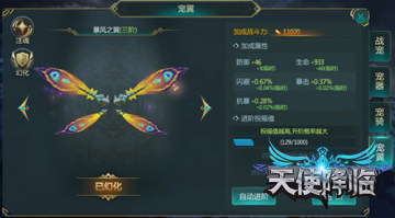 系统简述:战宠所穿戴的羽翼,可通过收集对应的升级道具或者直接花费绑钻和钻石进行升级。升级后,增加游戏角色对应的属性,并且获得新的战宠羽翼形象,可以直接在场景中展示出来。