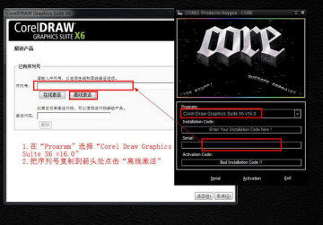 18、第十八步:输入序列号在“Proaram”处选择“Corel Draw Graphics Suite X6 v16.0”-然后把激活码获取工具里面的序列号复制到图中箭头处,点击“离线激活”。