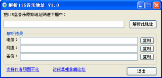 一款115网盘音乐地址的解析工具,使用方法很简单,将链接复制到指定窗口内即可,可解析电信、网通和备份三种结果。