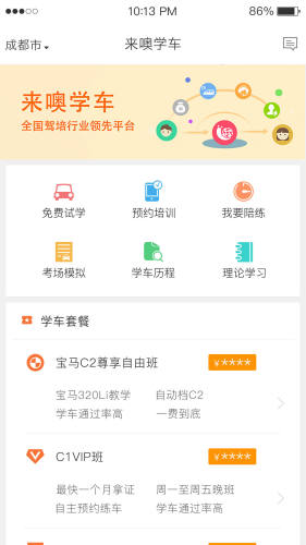 来噢学车是实现学车一条龙服务的APP,优质教练在来噢学车为您提供标准化服务,使您足不出户,即可完成报名、培训、理论、约考、模拟、排号、状态查询等繁杂的学车事项。完善的质量监控体系和信誉管理体系,真正做到“你学车,你做主”!(目前仅限成都地区)