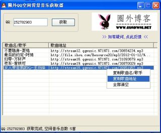 很多时候访问打开一个好友的qq空间,感觉她的空间背景音乐真的太好听了,然后就特别想把他的背景音乐设置成自己qq空间的背景音乐;但是,在qq空间添加背景音乐是需要音乐文件的url链接的(往往很多歌曲链接都不好找,而且质量不高),这时候就不知道怎样才可以把他背景音乐的url地址弄过来。现在这都不是问题了,因为圈外qq空间音乐获取器已经完美解决了这一问题。