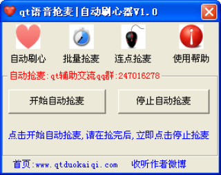 qt语音社区最新推出了qt语音自动刷心器工具,可以帮助玩家自动刷心、批量抢麦、连点抢麦,软件使用简单,点击开始自动抢麦即可,注意抢完后,记得立即停止自动抢麦哦。