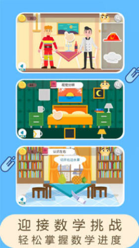 通过游戏化的场景增加孩子的兴趣,知识点包括时间、空间、分类、找规律、数字的认识、加减法则运算等内容,