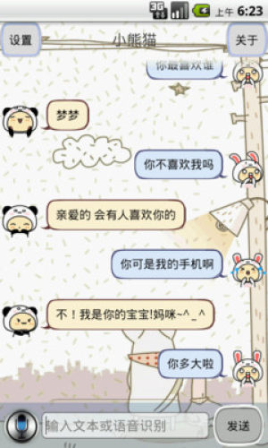 小熊猫是一款Android手机端的智能聊天机器人软件,可以让你的手机也拥有“生命”,让你可以与Android手机之间进行对话
