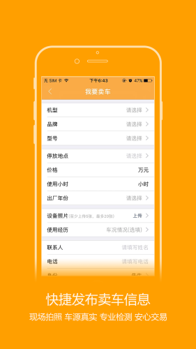 高效轻松,点击卖车,便可填写工程机械设备信息,经平台审核后,买车用户便可以轻松查看和购买。