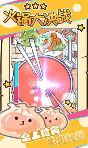 火锅大决战手游是很有休闲乐趣的一款美食争夺战游戏,游戏中玩家需要通过自己的操作和反应速度,来和对手争夺火锅食物,玩法简单新奇,适合茶余饭后,开心游戏,消遣生活乐趣。
