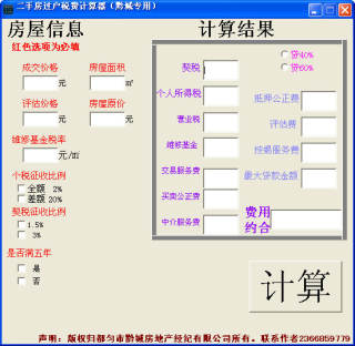 二手房过户税费计算器是一款税费计算器,能够帮助用户解决二手房过户费计算问题。使用方法很简单,用户只需填入二手房成交价格,房屋面积,个税征收比例,契税征收比例等参数后,直接按“计算”按纽即可计算出二手房过户费。