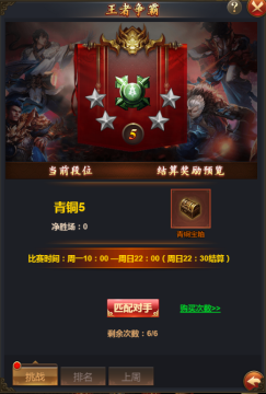 玩家达到80级可以参与王者争霸玩法。王者争霸每周日22:30结算,在结算周期内,玩家可以与本服80级以上玩家一起匹配竞技,提升竞技段位。结算时,段位越高,获得的奖励越好。