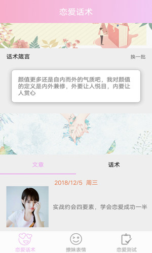 恋爱指南app,是为恋爱新手们准备的一款恋爱指导类软件,其提供了恋爱话术、撩妹表情以及恋爱测试等服务,让每个新手都能从最基础的获得恋爱的窍门。