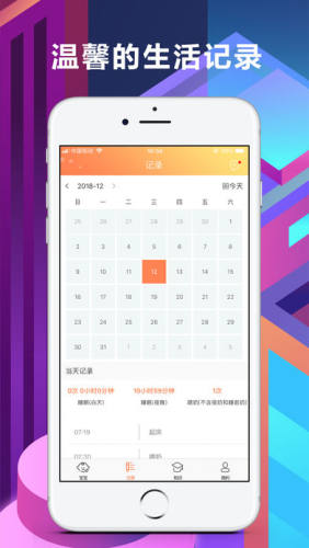 功能四,温馨的生活记录:APP提供宝宝生活的记录功能,让您可以随时查看过往每一天宝宝的生活作息,睡眠时长等信息。