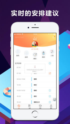 功能一,实时的安排建议:慧安睡APP,由国际认证婴儿睡眠咨询师开发,致力于帮助2个月-18个月的家长合理安排宝宝的睡眠,提供定制化的生活作息安排,根据您所录入的宝宝的每一次起床、入睡、睡醒、喂奶的时间,在宝宝实际作息基础上,实时的指导和更新宝宝接下来的睡眠及生活安排建议,帮助宝宝规律生活,养成良好的作息习惯。