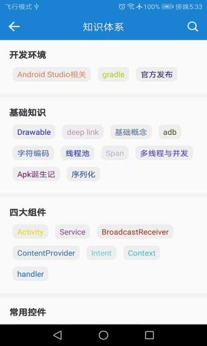 而知识体系又分为开发环境、基础知识、四大组件、常见控件、用户交互等种类。