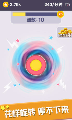 游戏操作简单,与真实版指尖陀螺一样,动动手指,使陀螺旋转,非常好的释放压力的游戏。进入游戏我们可以看到一个指尖陀螺,而我们只需要用手指滑动陀螺下方屏幕,即可让陀螺旋转起来,滑动的速度则决定了陀螺最终旋转的圈数。