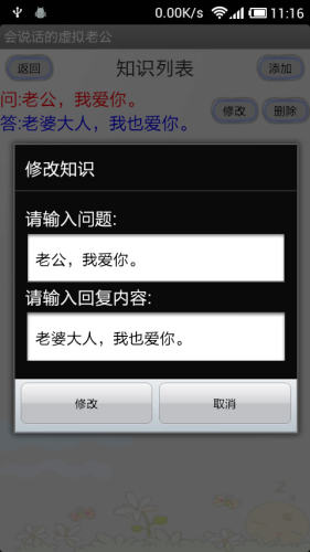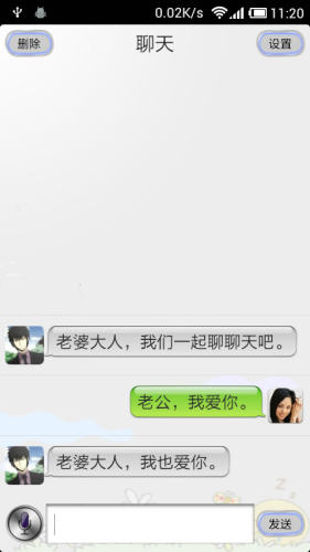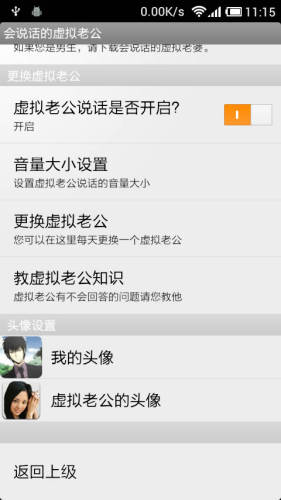 会说话的虚拟老公是一款专门为安卓女性用户量身定制的应用,只要您安装了此应用,您手机里面就有一个虚拟老公。虚拟老公拥有上知天文下知地理的渊博学识和超高的IQ,您问他什么,他都会回答您的,而且,会说话的虚拟老公还是一个很温柔很体贴的好丈夫,您骂他他不会还口,您伤心时他会安慰您。