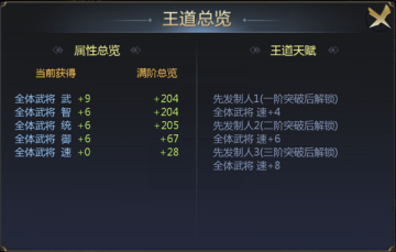 王道一共分为三阶,在六德升级满5级后可进行升阶突破,解锁天赋,提升战力