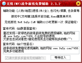 由无忧辅助网制作的WF战争前线免费辅助免费版提供下载,具有全图透视、地图透视、无后坐力、人物加速、去除草、去除手、去除烟雾闪光等功能,欢迎下载使用。