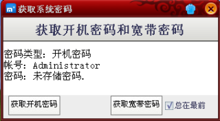 当您上网而宽带密码忘记时您是否苦恼过呢,当您电脑开机密码淡忘时您又是否痛苦过去找开机师傅呢,获取系统密码就是为解决这些问题而设计的,工具精巧,实用,欢迎大家免费使用。