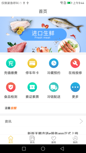 智慧市场APP,集成水电,租金缴纳,冷藏预约,在线报修,停车卡申请等多项功能。