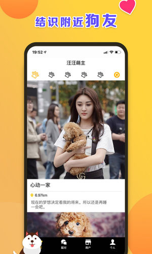 在“汪汪萌主”,我们希望为爱狗人士搭建一个快速、高效的交友平台。我们每天都会为用户推荐附近的狗友,只要双方彼此有好感并点击喜欢对方就能成功匹配并进行更深入的沟通交流,甚至相约遛狗。