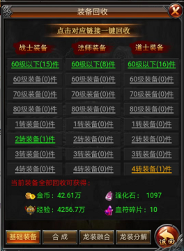 打开背包界面就能看到回收装备的按钮,点开,按职业等级回收不需要的装备,千万别点错,3转以上的装备可以合成圣装、神装;武器和衣服的回收价值会比首饰等装备高。
