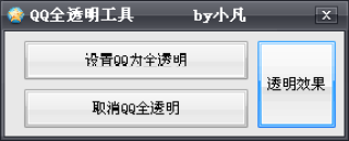 小凡制作的一款QQ全透明工具,可以一键设置QQ为全透明皮肤效果,省去了搜索,省去了新建文件等繁琐操作,只需要轻轻点击一下即可,同时还支持取消QQ全透明功能,目前仅提供一张QQ透明效果设置,以后的更新中,将会逐步添加,敬请期待。