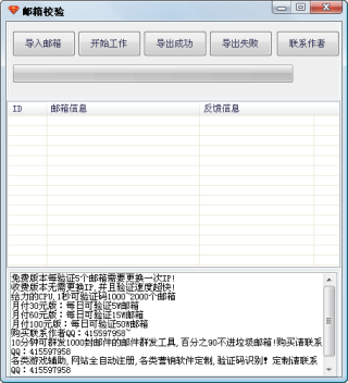 随风邮箱校验是一款免费的检测邮箱是否可用工具,以确定对方的邮箱到底有没有在使用,本软件推荐配合邮件群发工具使用,10分钟可群发1000封邮件,百分之90不进垃圾邮箱,使用简单,只需导入欲检测的邮箱即可使用。