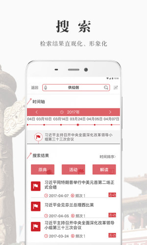 本APP软件是以领导人十八大以来的系列活动、讲话为核心数据的专业化数据查询应用软件。