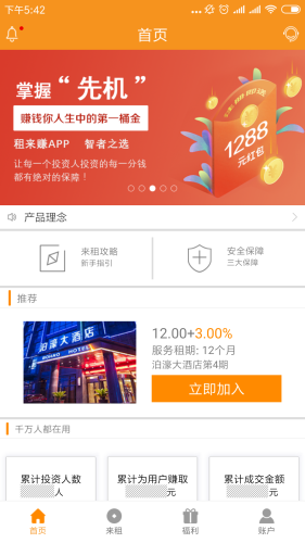 租来赚是一款专注于真实商铺在线租借赚钱的app。使用租来赚app,就能在线选择你看中的商品,通过在线租赁的方式来获取它的短期经营权。帮助你轻松赚取营业利润,想要尝试一下这款软件的朋友快来下载吧!