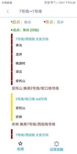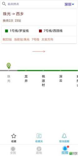(5)查看两站台间路线,可设置路线为提醒路线,收藏路线,查看收藏夹并将收藏路线设置为提醒路线。