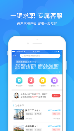 针对蓝领用户,求职者无需往返奔波,锁定岗位,一步到位,可通过蓝领通云服务实现随时求职,随时享受线下贴身就业服务。