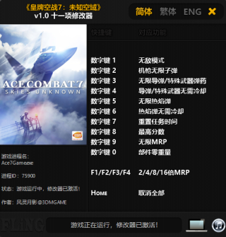 皇牌空战7未知空域修改器是一款针对游戏皇牌空战7未知空域的辅助工具,它是由风灵月影制作,能在十一个属性上对游戏进行修改,让玩家拥有无敌模式,最高分数,无限热焰弹等属性,大大降低了游戏难度,能够让玩家轻松游戏,欢迎下载使用。