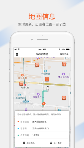 一键求助——快速地为自己或他人发出求助,并在求助过程中,通过文字、语音、图片等信息,实时了解志愿者的位置信息;