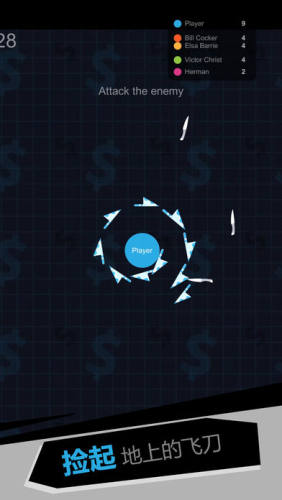 3、极简的游戏画风,通过利用一大堆的飞刀熟练操控进行混战,秀死对手。