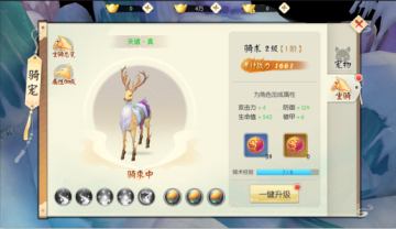 坐骑和宠物差不多,但是只能通过坐骑升级丹来升阶,和宠物差不多。后期还有机会获得梦幻坐骑,加成更加强悍,外观也更加酷炫哦。